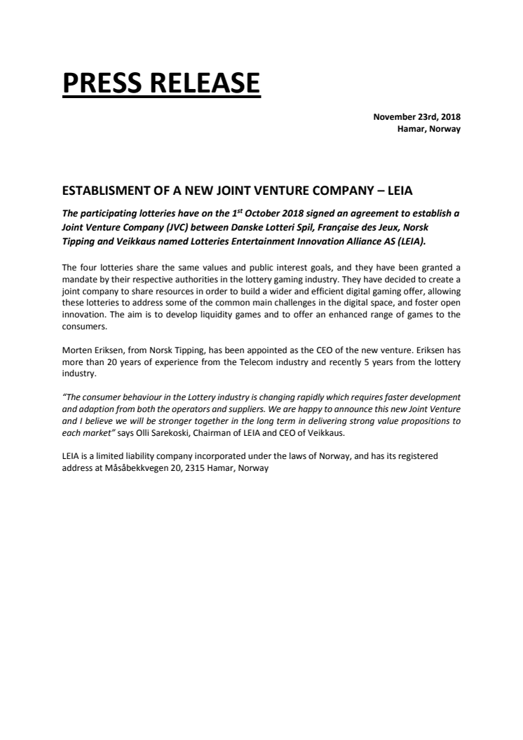 ESTABLISMENT OF A NEW JOINT VENTURE COMPANY – LEIA