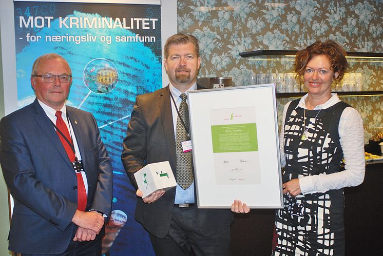 Sikkerhetssjef Trond Laupstad mottok Fidusprisen fra statssekretær Hans J. Røsjorde og konst. adm. dir i Norsis, Tone H. Bakås.
