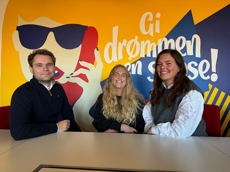 Norsk Tippings kampanjeteam for «Drømmeduo»: F.v. Magnus Solberg Nygård, Kristin Pålsrud, Ida Mellbye Løvås.