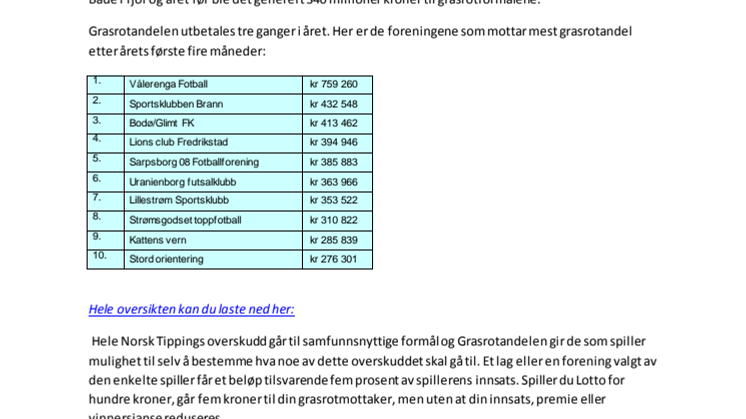 Grasrotandelen utbetales tre ganger i året. Her er de foreningene som mottar mest grasrotandel etter årets første fire måneder:
