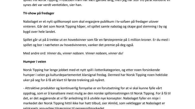 - Attraktive produkter og kontinuerlig fornyelse er en forutsetning for at vi skal kunne fylle vårt oppdrag, som er å kanalisere mest mulig av den norske spillomsetningen til Norsk Tipping. For å få til det, er det avgjørende at vi får anledning til å utvikle nye konsepter. Nabolaget fyller en nisje i markedet der Norsk Tipping hittil ikke har hatt tilbud, sier Almlid, som vektlegger at Nabolaget er selskapets ansvarlige tilnærming til pengespillmarkedet.