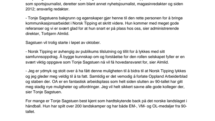 - Jeg er ydmyk og stolt over å ha fått denne muligheten til å bidra til at Norsk Tipping lykkes og jeg gleder meg veldig til å ta fatt. Samtidig er det vemodig å forlate Oppland Arbeiderblad og staben der. OA er en fantastisk arbeidsplass som helt siden slutten av 90-tallet har gitt meg stadig nye muligheter og utfordringer. Jeg vil helt sikkert savne alle gode kolleger der, sier Tonje Sagstuen.